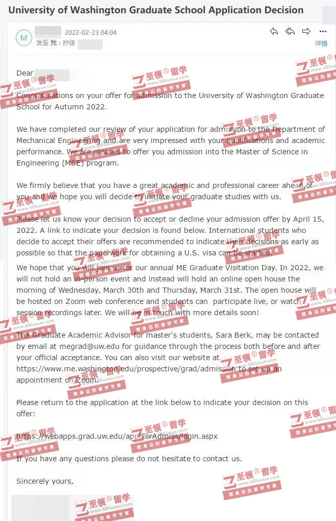 录取结果:University of Washington,Master of Science in Mechanical Engineering 华盛顿大学机械工程硕士录取