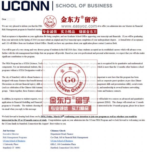 在申校的过程中,全公开透明的原则,让学生参与到申请的每一步,针对学生的疑问,我们金东方的老师进行了耐心而细致的解答,各项步骤都及时高效的完成,最终帮助学生顺利获得了康涅狄格大学金融风险管理录取。