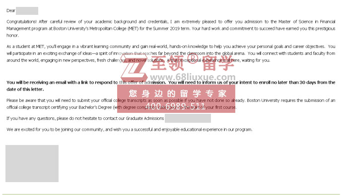 录取结果:Boston University(波士顿大学),Master of Science in Financial Management金融管理硕士