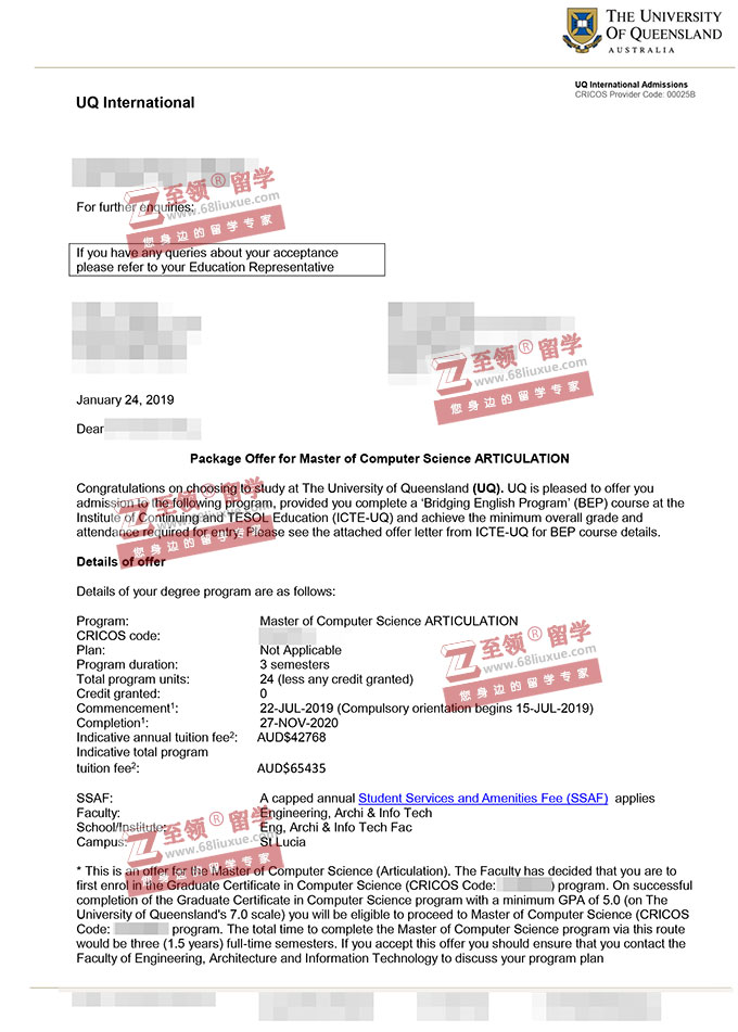 录取结果:The University of Queensland (UQ),Master of Computer Science ARTICULATION昆士兰大学CS硕士